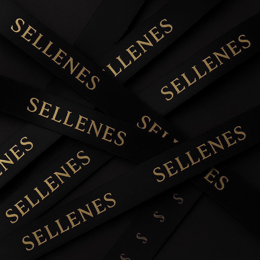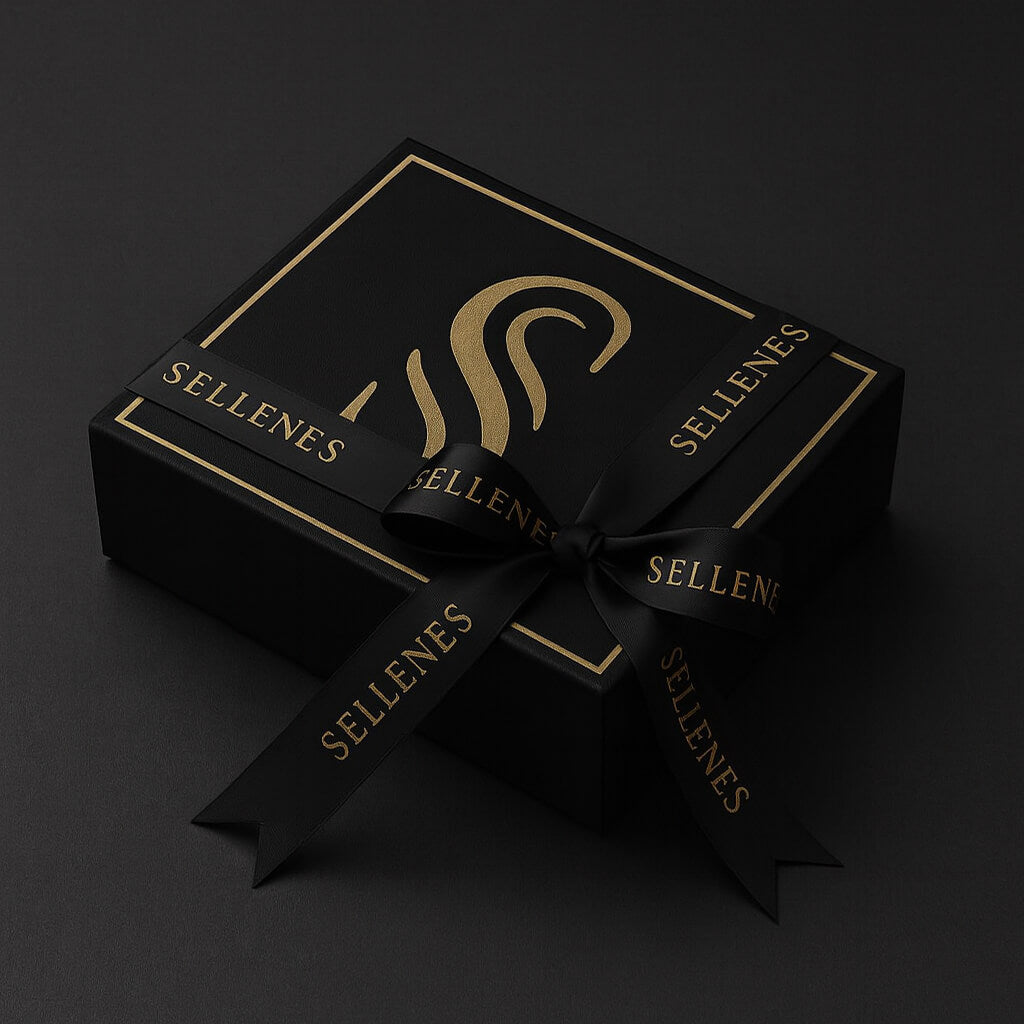 A 1 or 2 cm double‑faced black satin ribbon, printed in gold with the Sellenes name, embraces the box in silent grace. Tied by hand, it is the final gesture before your piece finds its new home.