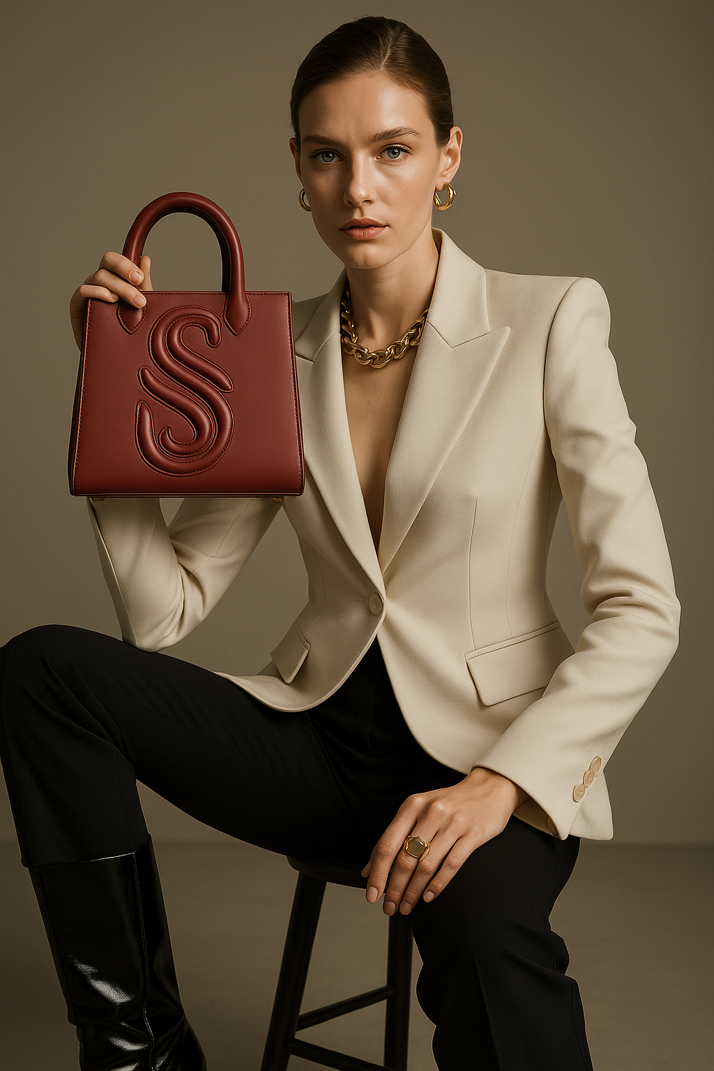 The Signature Mark - The refined exterior is punctuated by an embossed Sellenes logo, which offers a subtle, yet unmistakable mark of distinction. The dimensional detail provides an elegant, sculptural look that speaks to the house's commitment to quiet luxury.