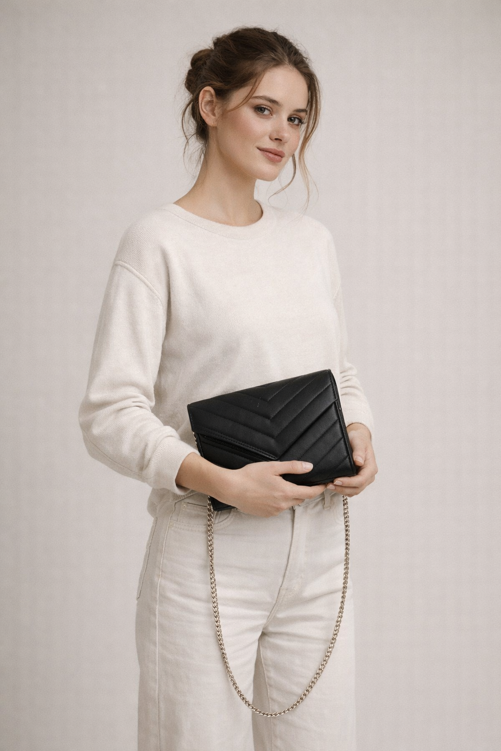 A premium metal chain allows versatile styling — worn on the shoulder, crossbody, or carried as a pure, minimalist clutch. Every line, texture, and stitch is designed to whisper elegance and endurance.